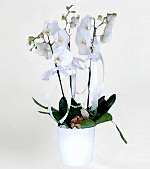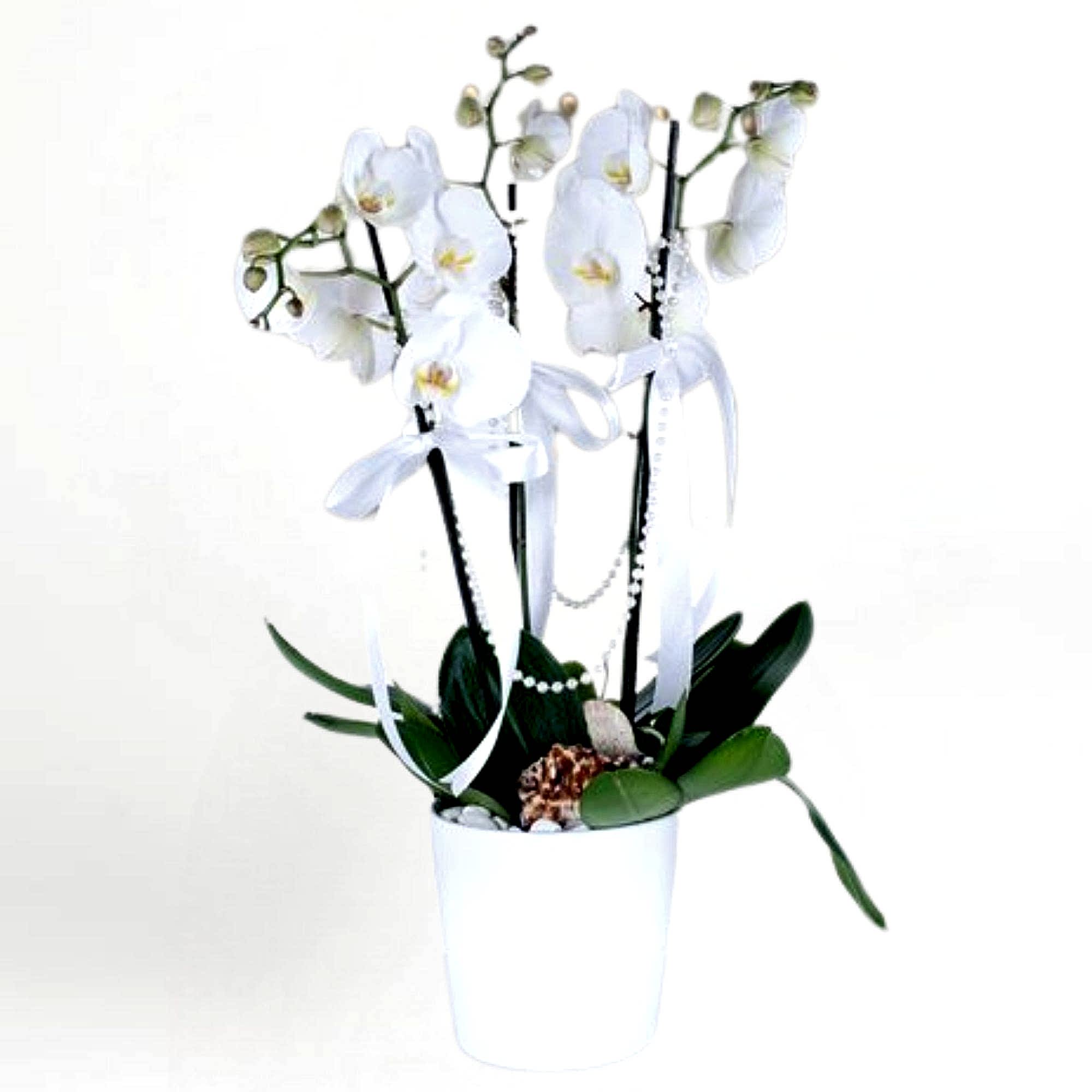 Saksı içerisine hazırlanmış 50 cm yüksekliğinde 3 adet beyaz orkide bitkisi. beyaz kurdela,renkli boncuk,