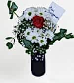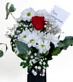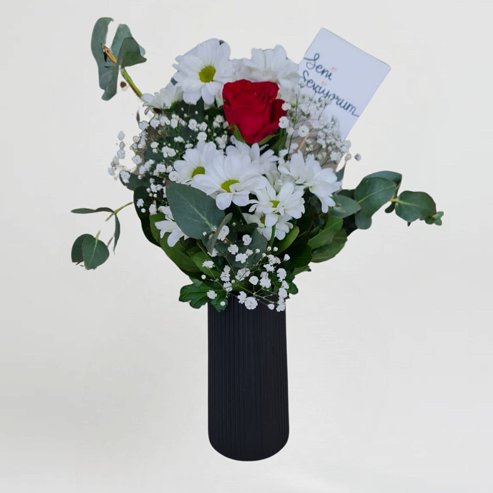 Sevginizi en saf ve zarif haliyle ifade edin! ❤️ Sevgi Bahçesi Buketi, beyaz papatyaların masumiyeti ve kırmızı gülün tutkulu ifadesiyle, duygularınızı en içten şekilde anlatıyor. Siyah şık vazo içinde sunulan bu özel tasarım, her anı unutulmaz kılmak için mükemmel bir seçim!